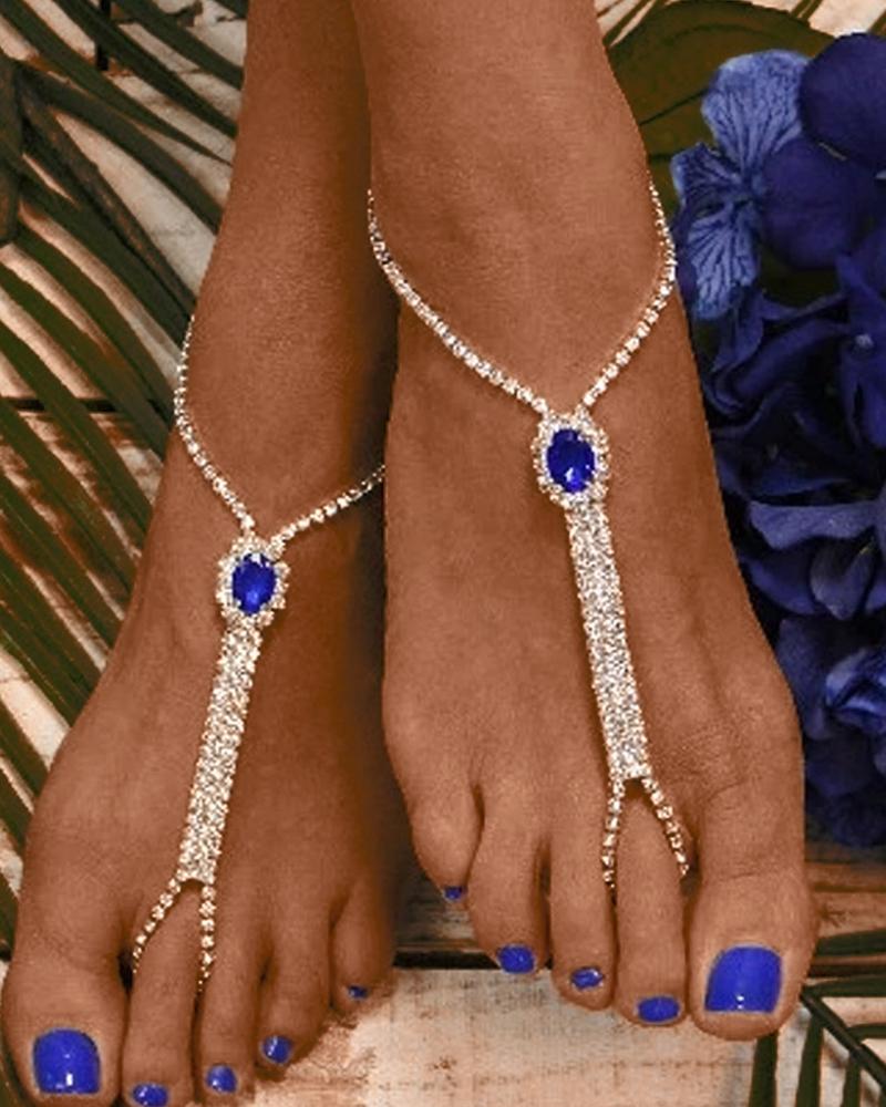 2pcs Crystal Stone Rhinestone Fashion Jewelry Toe Ring Beach Anklets Set, Blue
