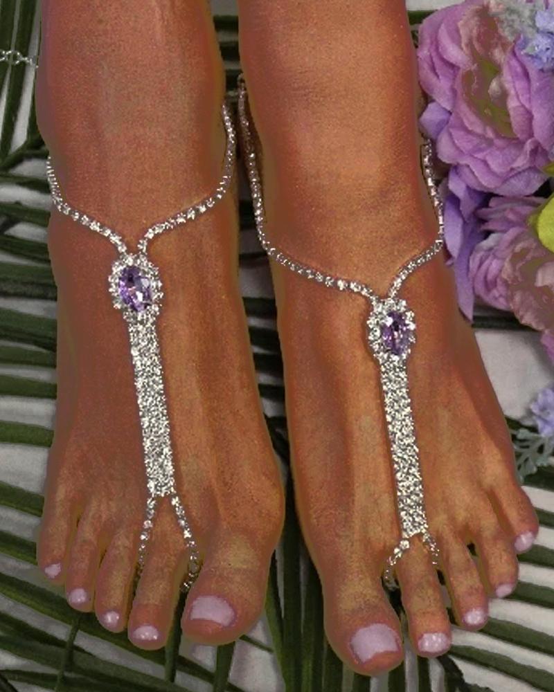 2pcs Crystal Stone Rhinestone Fashion Jewelry Toe Ring Beach Anklets Set, Purple