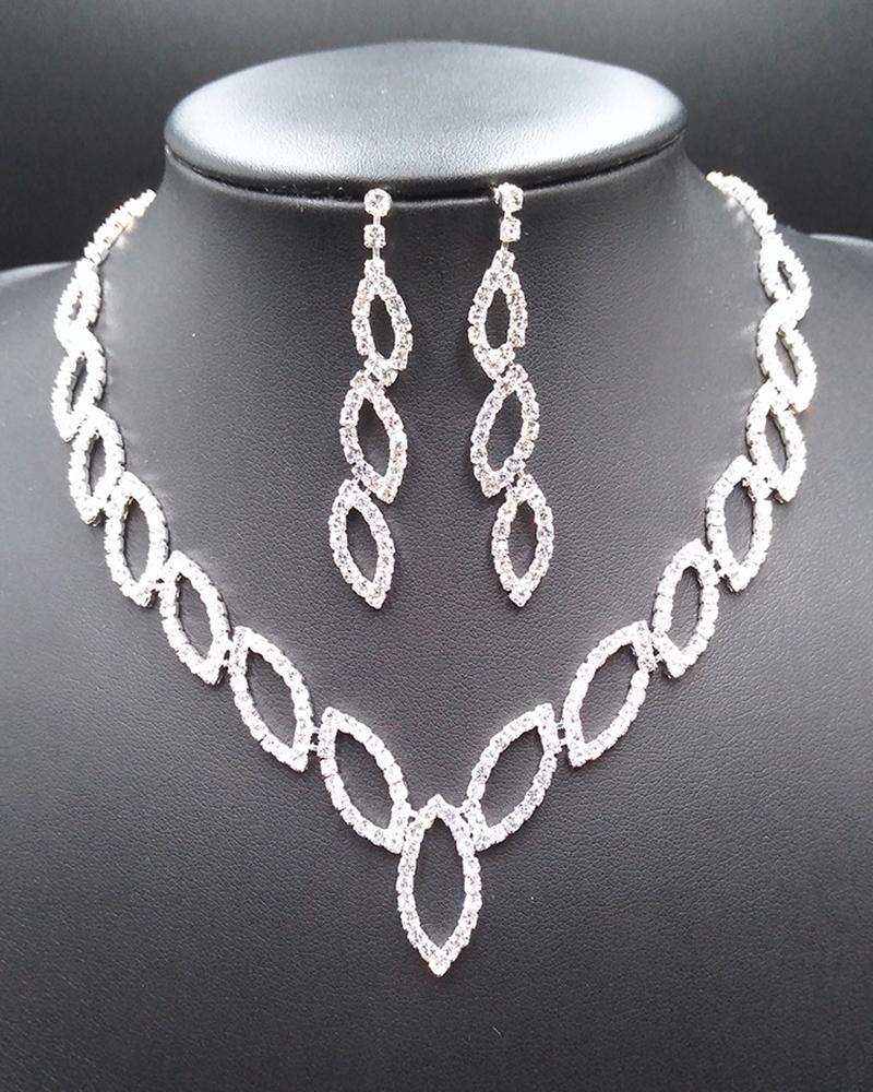 2pcs Hollow Out Rhinestone Leaf Pattern Necklace & Drop Earrings Jewelry Set, Silver