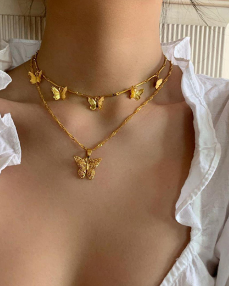 2pcs Multi Butterfly Pattern Double Layered Necklace, Gold