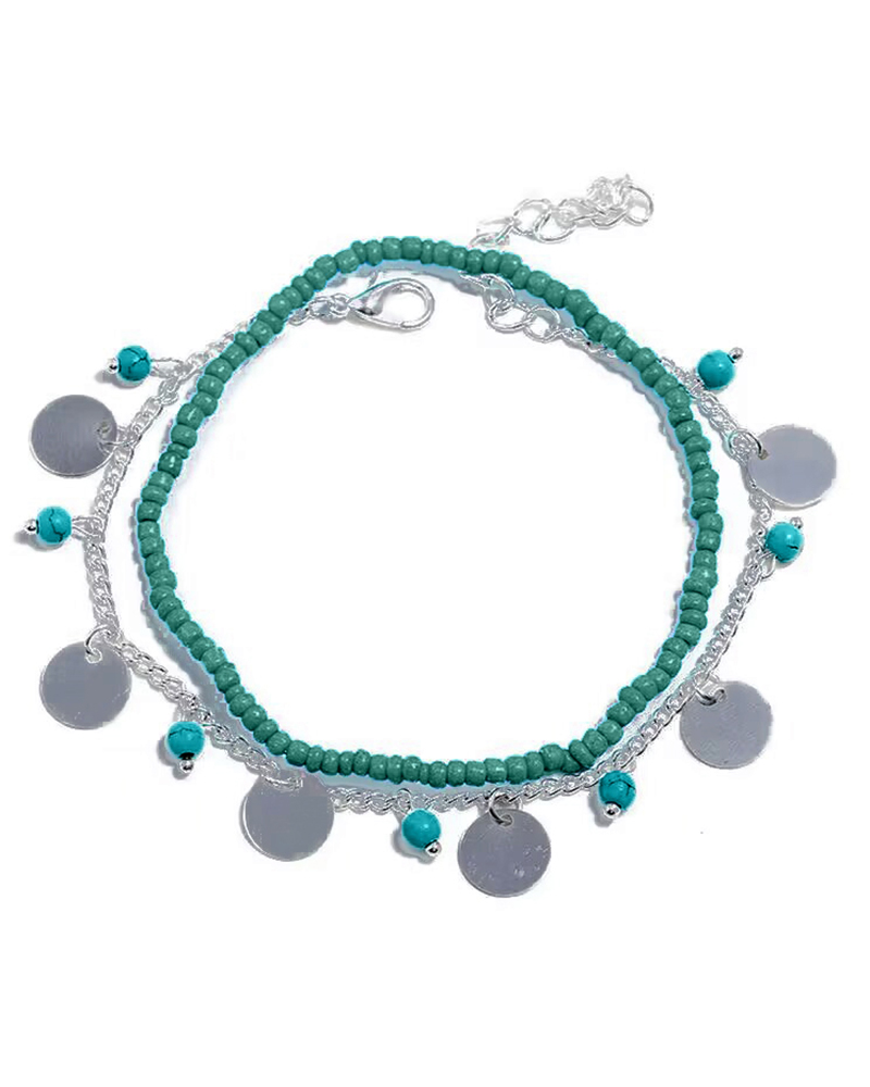 2pcs Stackable Beaded Disc Bohemian Summer Beach Anklets Set, Silver