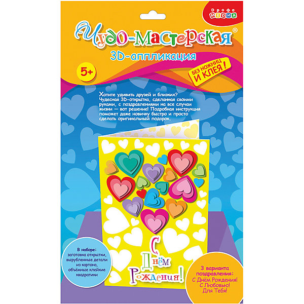 • комплектация: заготовка открытки, набор деталей из картона, объемные наклейки, цветная листовка-образец