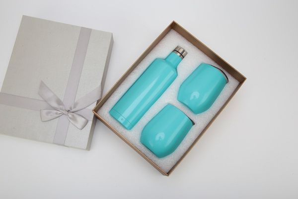 type:gift set with one wine bottle and two cups we have stainless,black ,blue these colors. pakcing:gift box(blue and white) please remark the color of box when placing the order. 500ml bottle+two 12oz tumblers 1.33 68