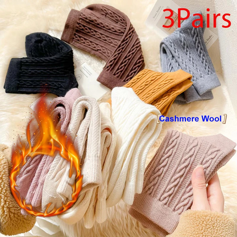 3 Pairs Cashmere Socks Winter Wool Women's Socks Thickened Pile Sock Black White Solid Simple Mid-Calf Warm Snow Boot Socks