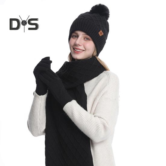 3 шт./компл. Зимняя шапка, шарф, перчатки, комплект, женская плюшевая шапка-бини с декором в виде мяча, вязаный длинный шарф, перчатки для сенсорного экрана, комплект, ромбовидная текстура, плюшевая подкладка, теплый комплект чёрный
