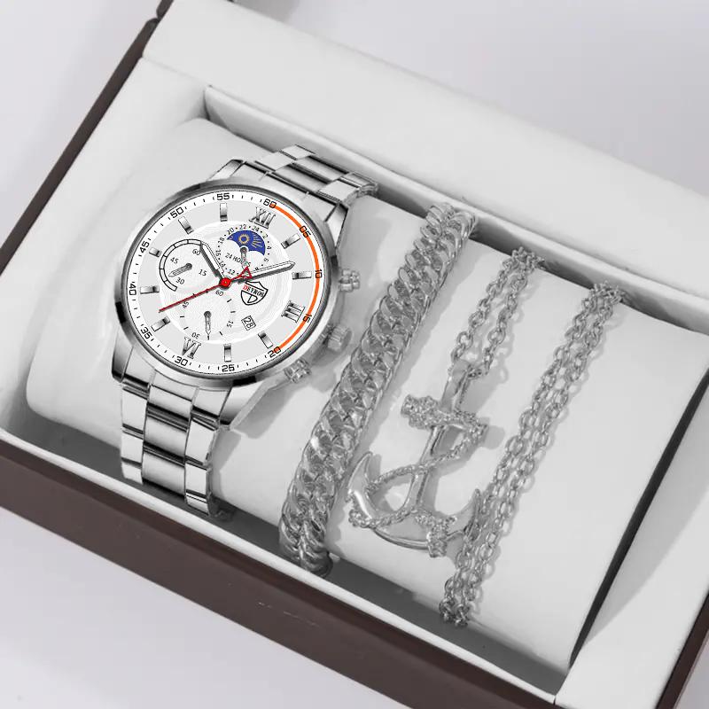 3 шт./набор, 1 шт. модные мужские деловые кварцевые часы из нержавеющей стали с календарем, 1 шт. мужской браслет, 1 шт. мужское ожерелье