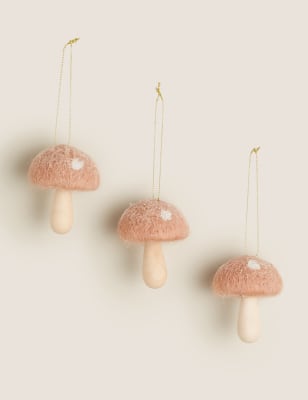 Kids will love hanging these enchanting toadstool decorations on the Christmas tree. They come in a pack of three and are made from plush felt fabric. These cute decorations have a pale pinky-gold top with white spots, adding a whimsical touch. These come in a cardboard box perfect for storing year after year.