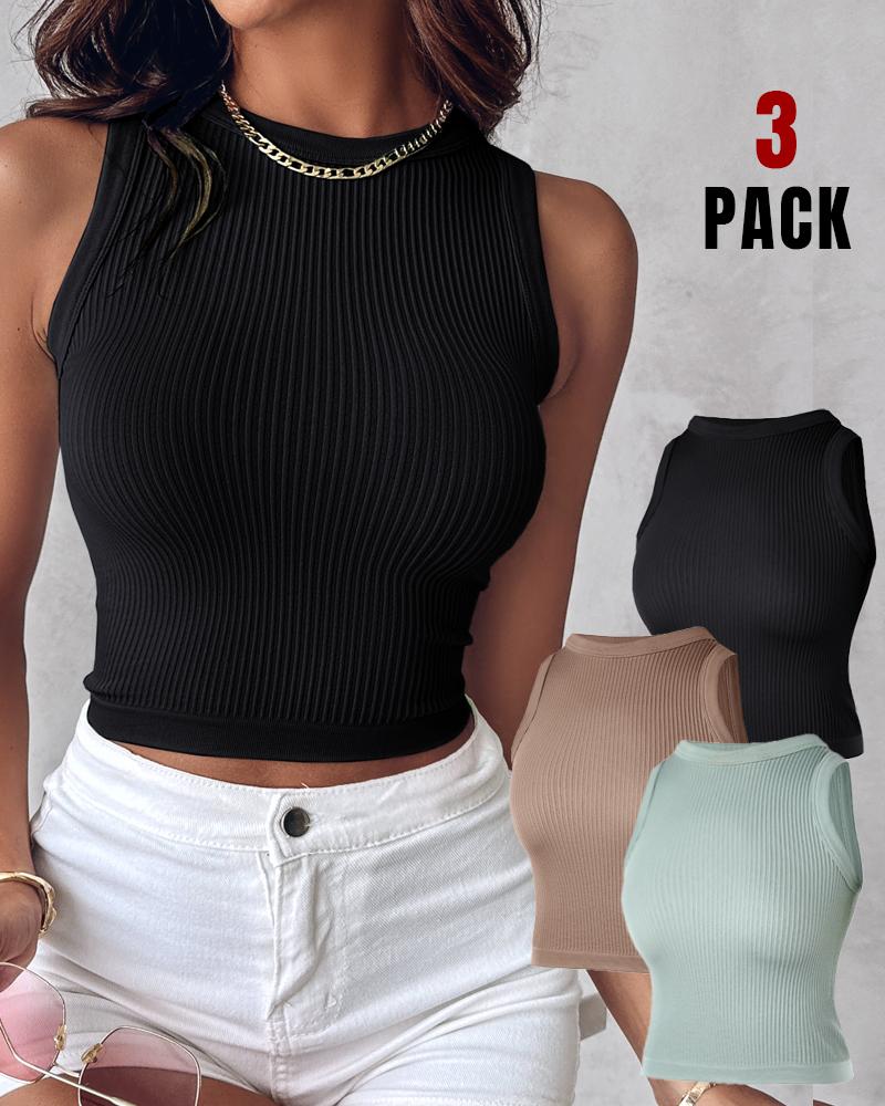 3 Piece Crewneck Racerback Ribbed Tank Tops Summer Basic Sleeveless Slim Fit Rib-knit Crop Tops, Style3