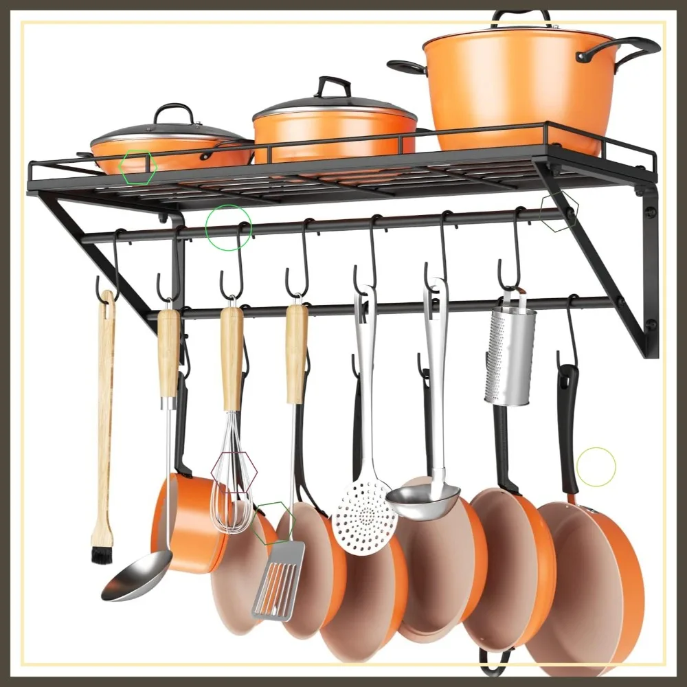 31 Inch Wall Mounted Pot Rack with 2 Tier Rails & 14 S Hooks, Black Storage for Pans Utensils Cookware