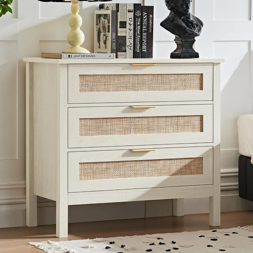 31.5-inch Wide Rattan Bedside Table, Large Bohemian-style Three-drawer Bedside Table, Bedside Table with Storage Function