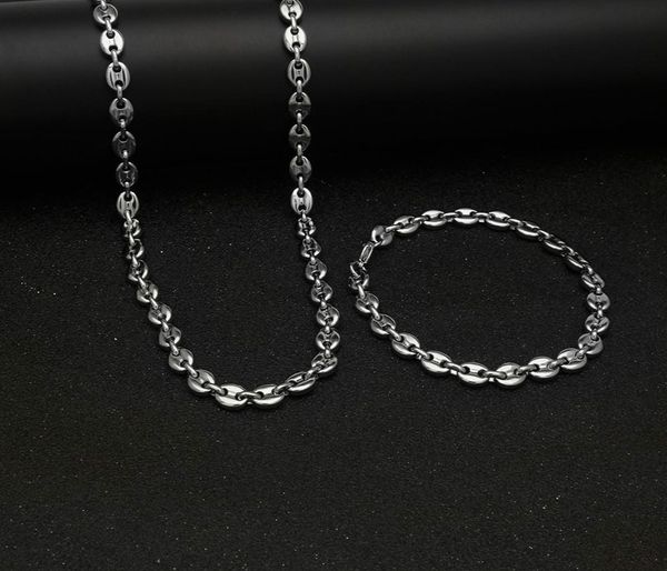316l stainless steel coffee bean chain 22"necklace and 8"bracelets fashion hip hop jewelry set gold chain for men, Silver