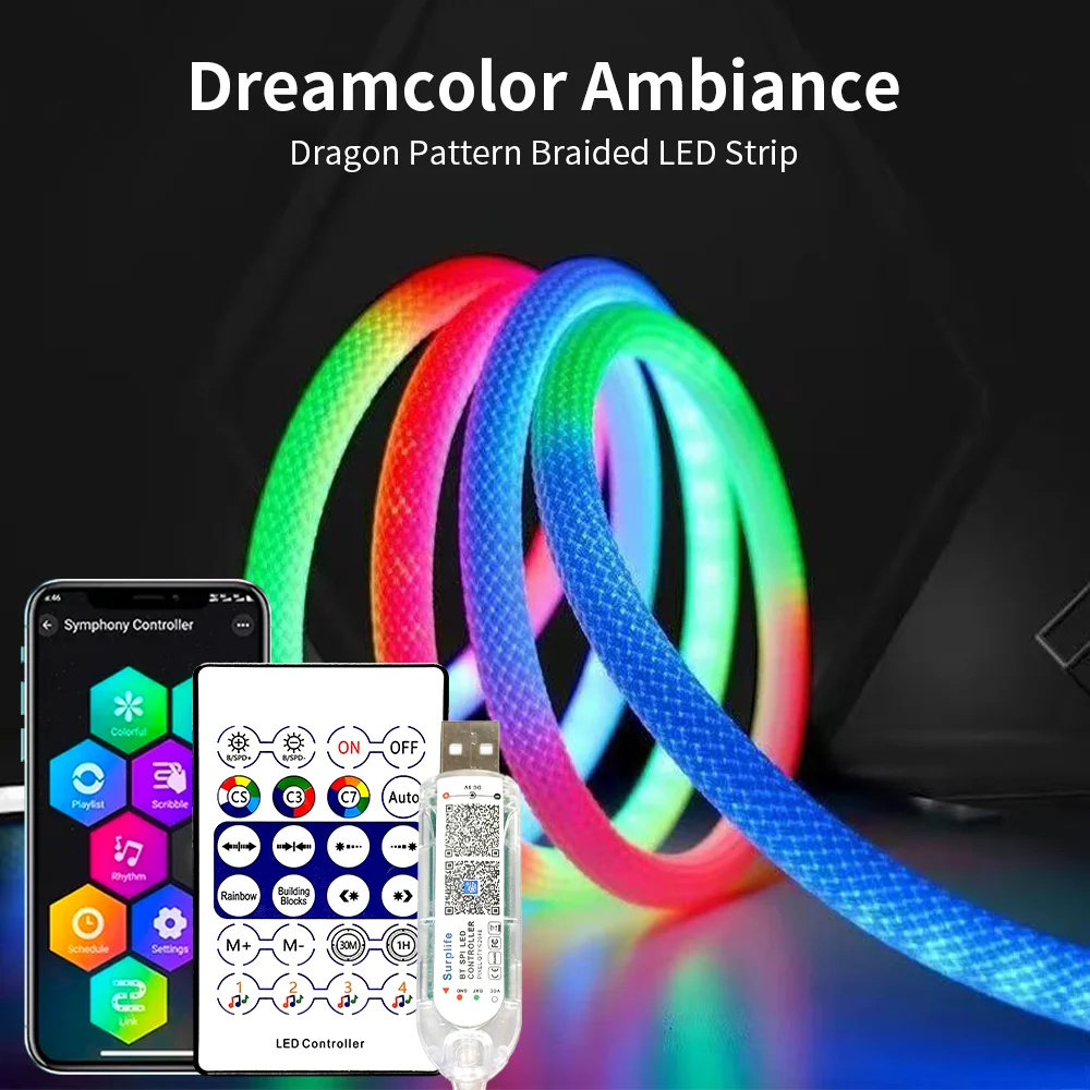360° 5V Braided Flexible RGB Neon LED Strip, USB Interface, WS2812B Dream Color Strip with 24-key Bluetooth APP Remote Control