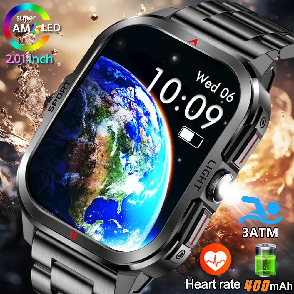 3ATM Waterproof Smart Watch Men 2.01 Inch Screen 400mAh Battery Flashlight Outdoor Sport BT Call Smartwatch For Android IOS 2025