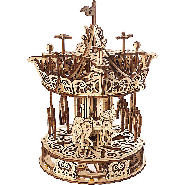 3D конструктор перенесет ребенка в удивительный парк развлечений. Можно собрать ту самую карусель, которую знает каждый. Поворотом рычага, находящегося в подставке, механизм начинает свое движение: карусель крутится, лошадки скачут вверх-вниз, центральный столб вращается в противоположном направлении.