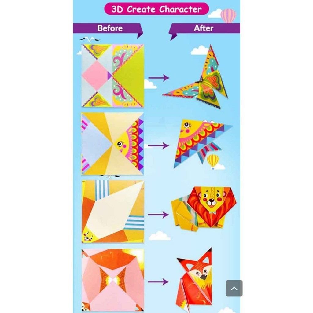 Dilengkapi dengan buku panduan yang berisi contoh seni melipat kertas dari yang sederhana hingga sulit.
