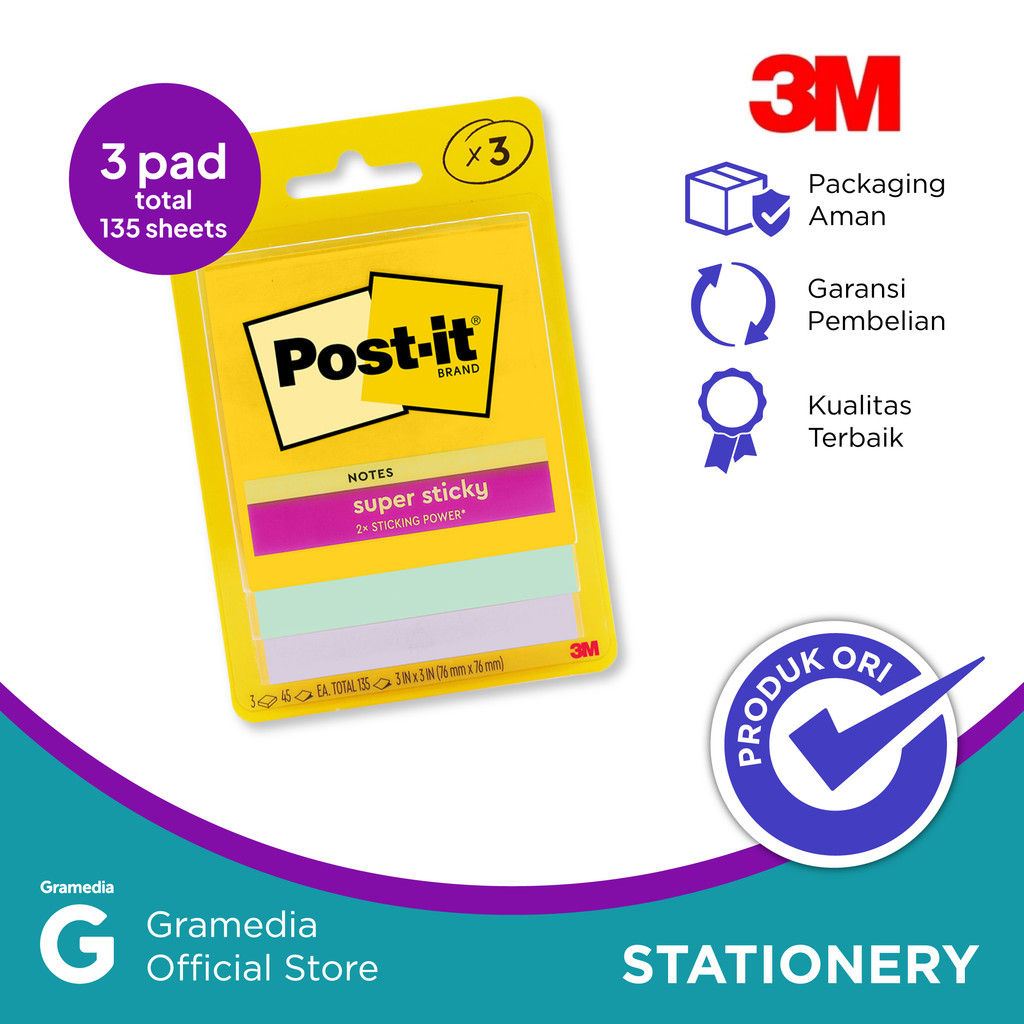 Merek : 3M Jenis Produk : Post It Post It Super Sticky Notes 654-4SS-SWT 3 inch x 3 inch Ukuran : 3" x 3" (76mm x 76mm) 1 pack isi 4 pad 1 pad isi 90 lembar 1 pack isi 360 lembar Kegunaan: 3M - Post It Super Sticky Notes 654-4SS-SWT 3 inch x 3 inch dapat digunakan untuk keperluan sekolah atau kantor, seperti menulis catatan yang penting. Keunggulan: Dapat menempel berulang kali, memiliki daya rekat 20x dibandingkan sticky note biasa, tidak meninggalkan bekas perekat, dapat digunakan di berbagai permukaan lain selain kertas, tetap menempel meskipun ditempel pada permukaan kertas yang melengkung, dapat didaur ulang, kertas berasal dari hutan yang tersertifikasi dan diolah secara bertanggung jawab.
