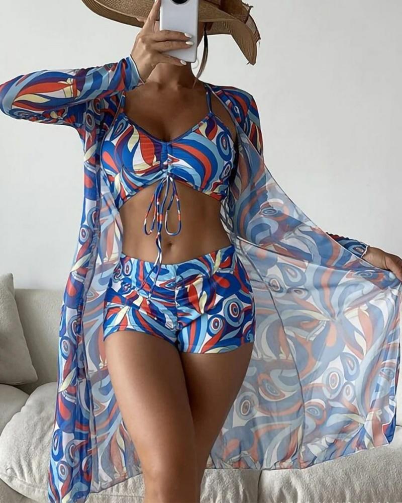 3PCS Abstract Print Drawstring Ruched Bikini Set With Cover Up, Blue