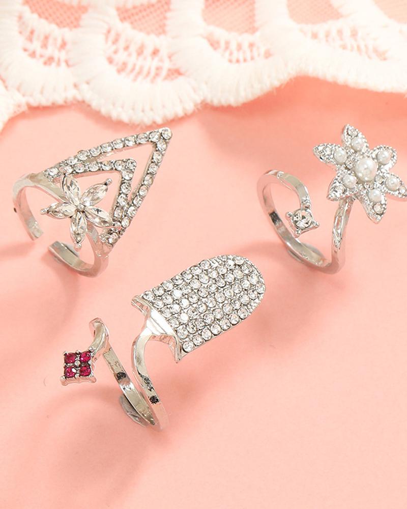 3PCS Beaded Rhinestone Decor Cuff Ring Set, Silver