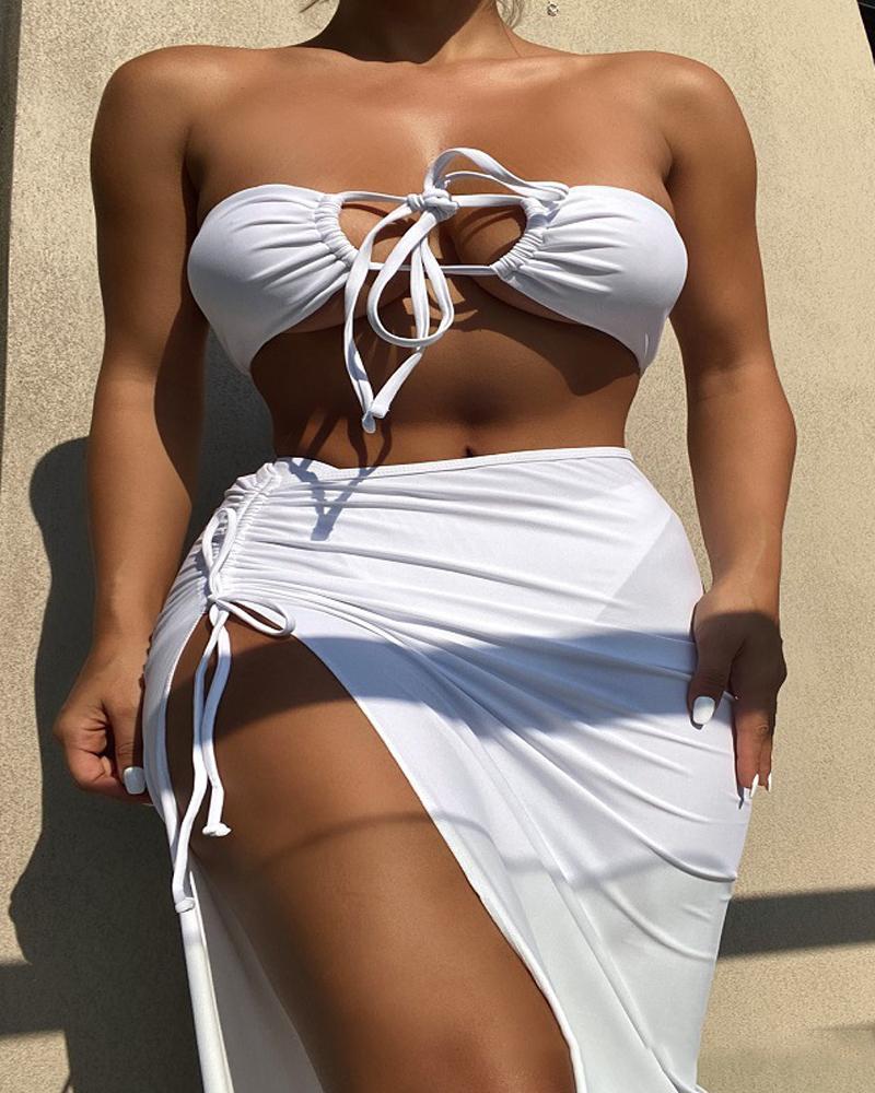 3PCS Bikini Set With Drawstring Ruched High Slit Cover Up, White