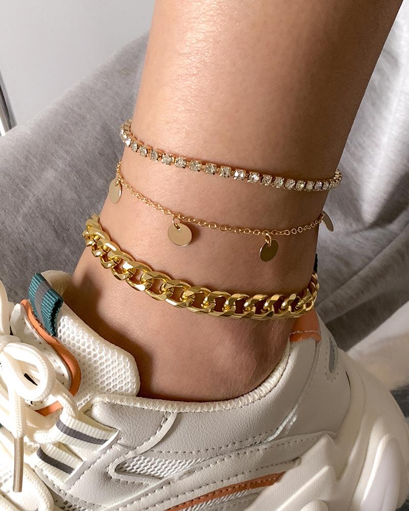 3PCS Cuban Link Chain & Rhinestone & Disc Anklet Set, Gold