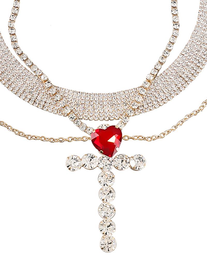 3PCS Heart Shaped Rhinestone & Cross Pattern Studded Layered Necklace, Red