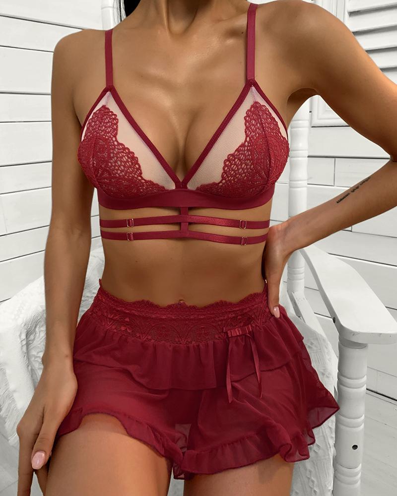 3PCS Lace Ruffles Sheer Mesh Lingerie Set, Red