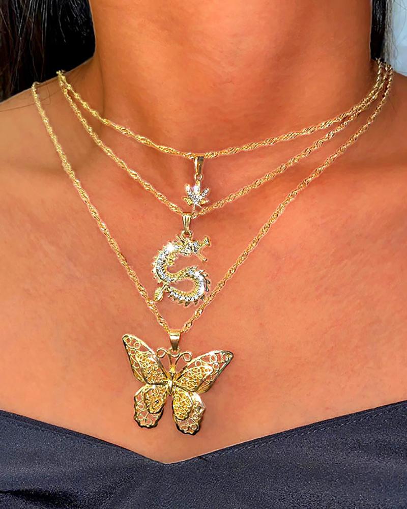 3PCS Leaf Dragon Butterfly Pattern Rhinestone Pendant Necklace, Gold