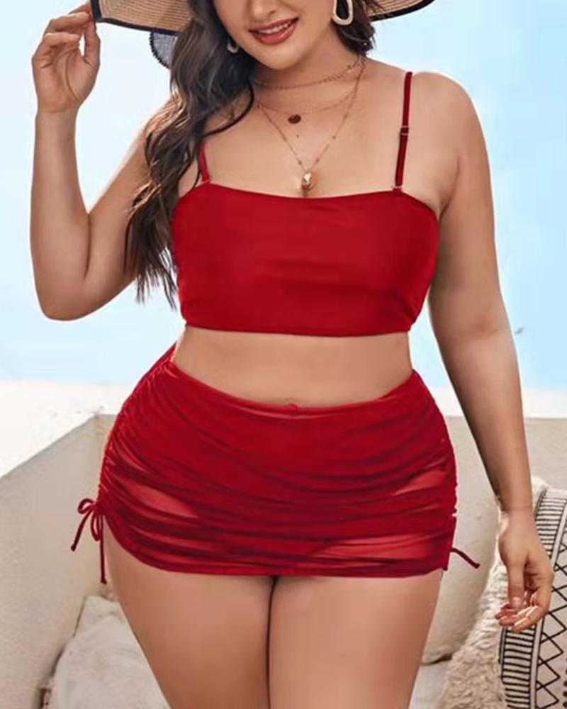 3PCS Plus Size Bikini Set With Sheer Mesh Ruched Cover Up Skirt, Red