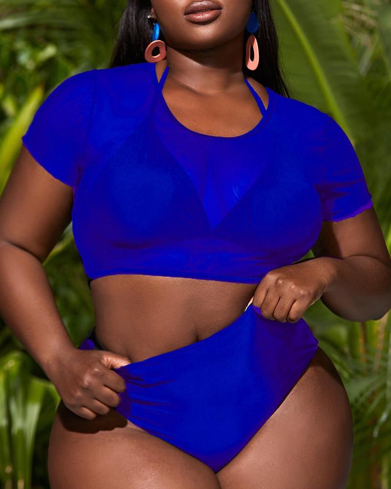 3PCS Plus Size Halter Bikini Set With Cover Up Top, Blue