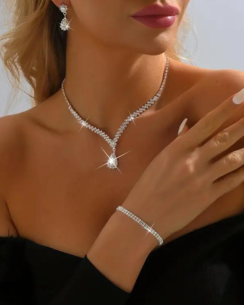 3PCS Rhinestone Decor Waterdrop Pendant Necklace & Drop Earrings & Bracelet Wedding Bridal Gift Jewelry Set, Style2