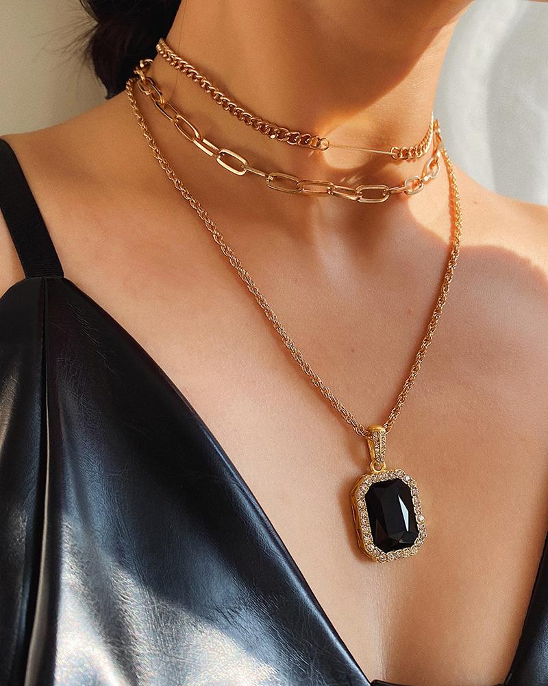 3PCS Rhinestone Geometric Gem Pendant Layered Necklace, Gold