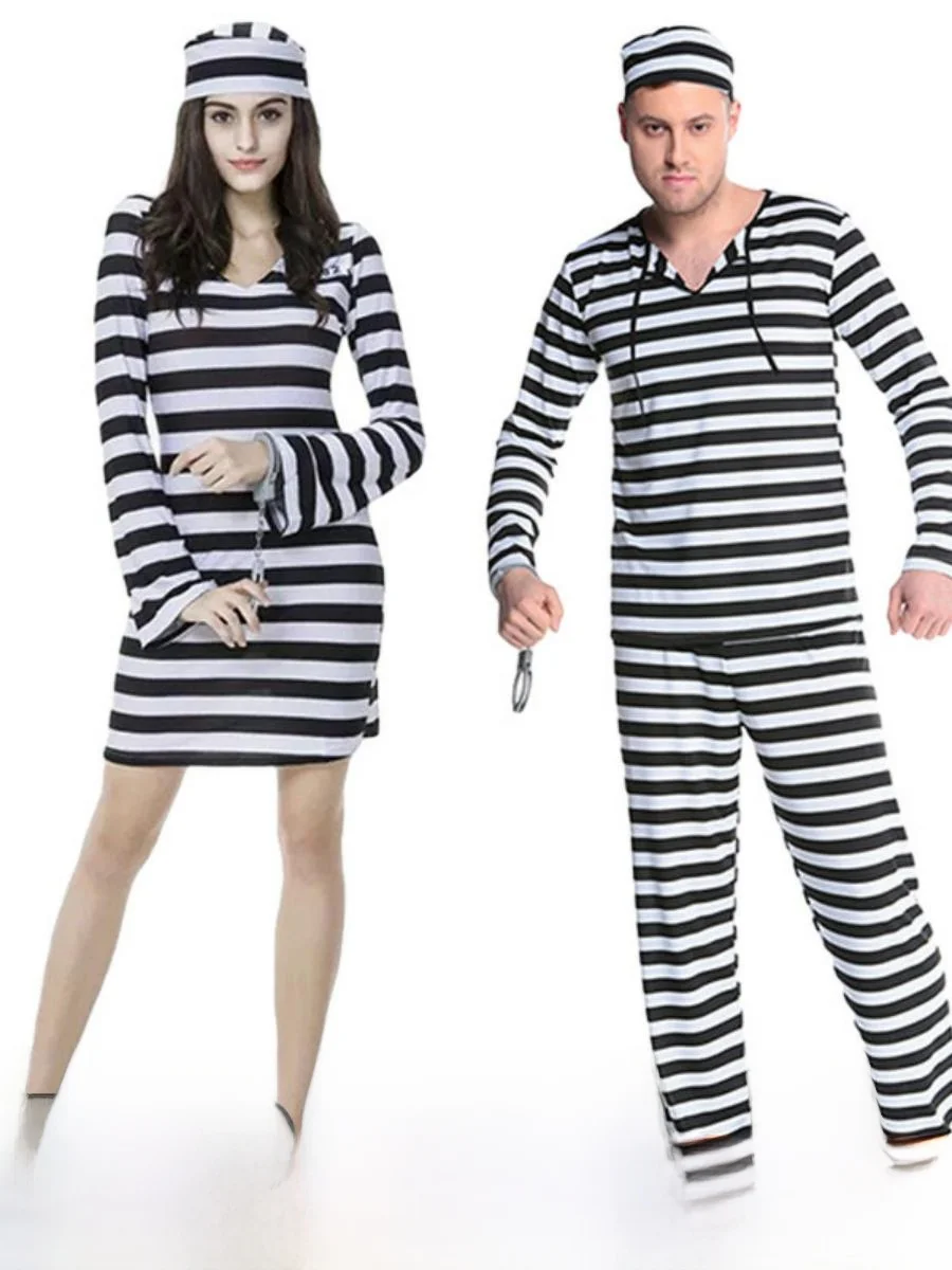 Новый костюм заключенного на Хэллоуин, косплей, одежда в полоску для пар, сексуальная праздничная сценическая одежда для взрослых, мужчин и женщин, смесь хлопка