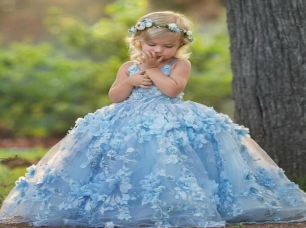 3d floral applique communion dress lovely vneck cross straps backless flower girl dress fluffy tulle birthday ball gown girls pag1521245, White;blue