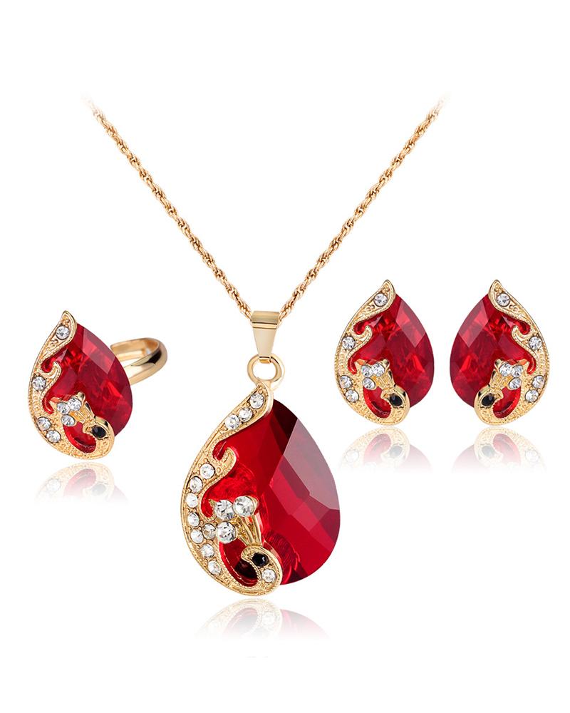 3pcs Gem Stone Rhinestone Pendant Necklace & Earrings & Ring Jewelry Set, Red