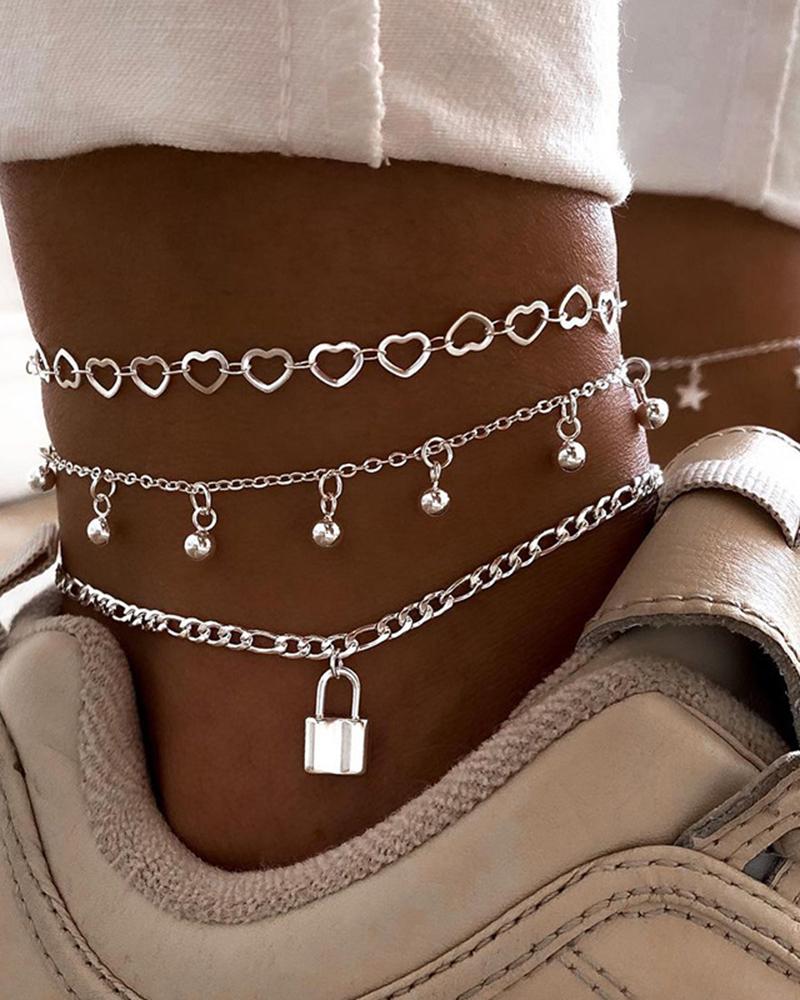 3pcs Heart Lock Pattern Tassel Design Anklet Set, Silver
