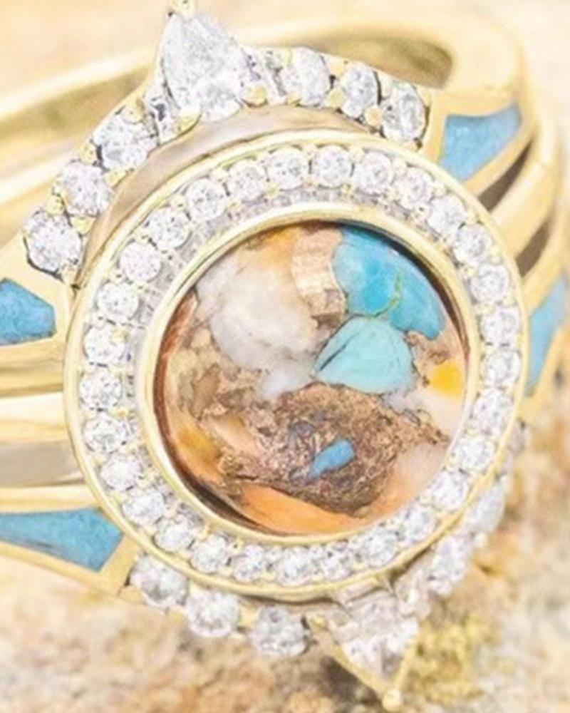 3pcs Rhinestone Decor Turquoise Matching Rings Set, Gold