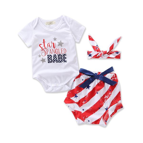 3pcs sets baby ins united states flag rompers girl cotton short sleeve romper+shorts+bows headbands baby clothes, Blue