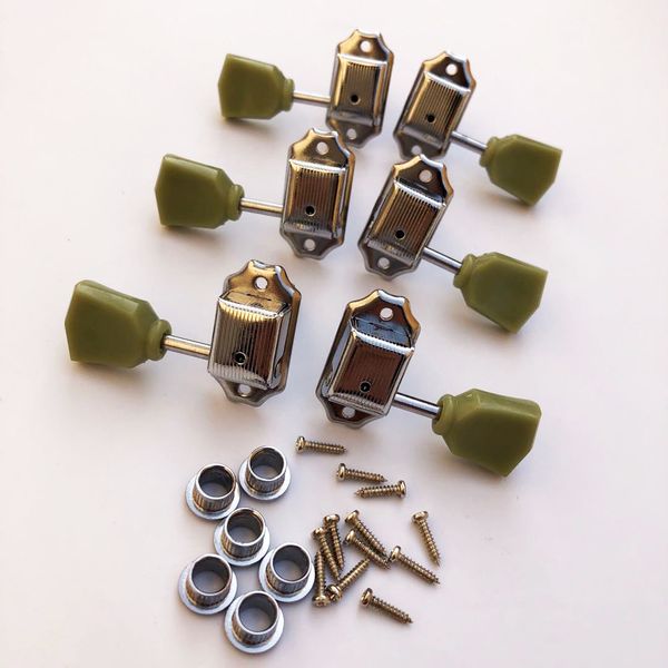 material: a3 steel fits for 6mm peg hole; with plastic keystone green buttons 3x3 tuners set,nut,ferrule ,screws are included modern 15:1 gearing for smoother, more precise action