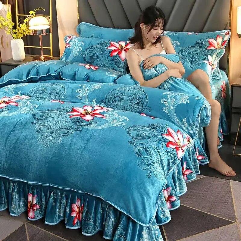 4 шт. комплект зимнего теплого утолщенного короткого плюшевого постельного белья с принтом, фланелевый пододеяльник, плоская простыня, наволочка, комплект постельного белья King Queen