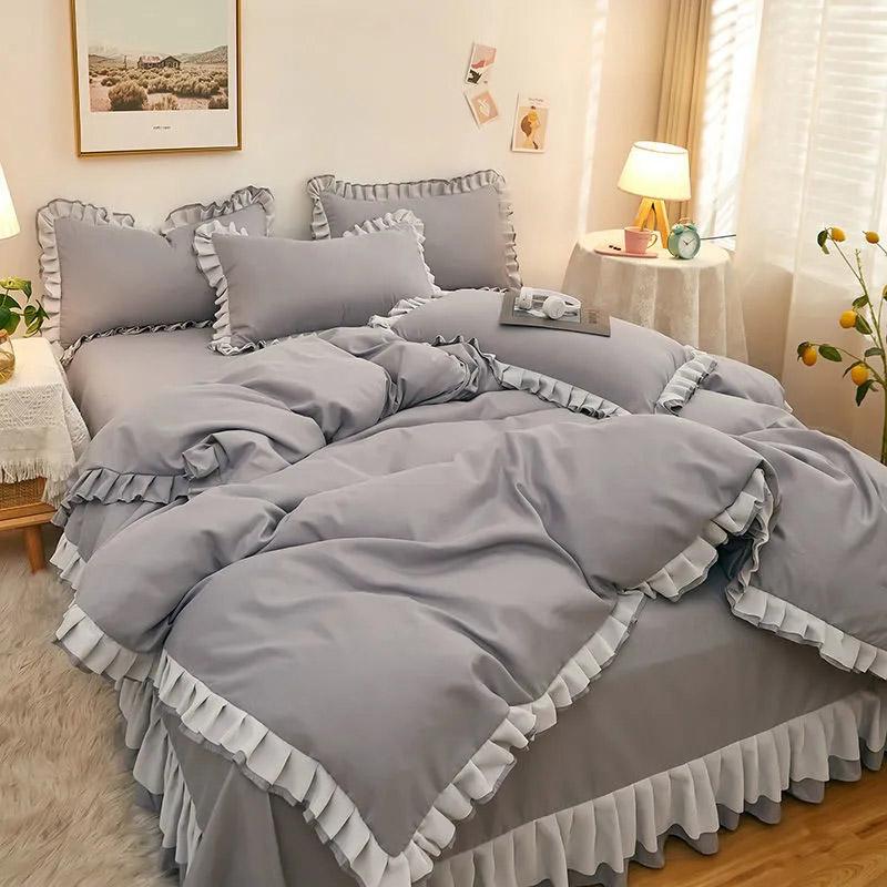 4 шт./комплект, наволочка из ворсистого стеганого одеяла, постельное белье, шифоновое кружево, стиль принцессы, корейская версия, комплект из четырех предметов, милый однотонный комплект постельного белья для девочек в общежитии Twin 4 pcs светло-серый
