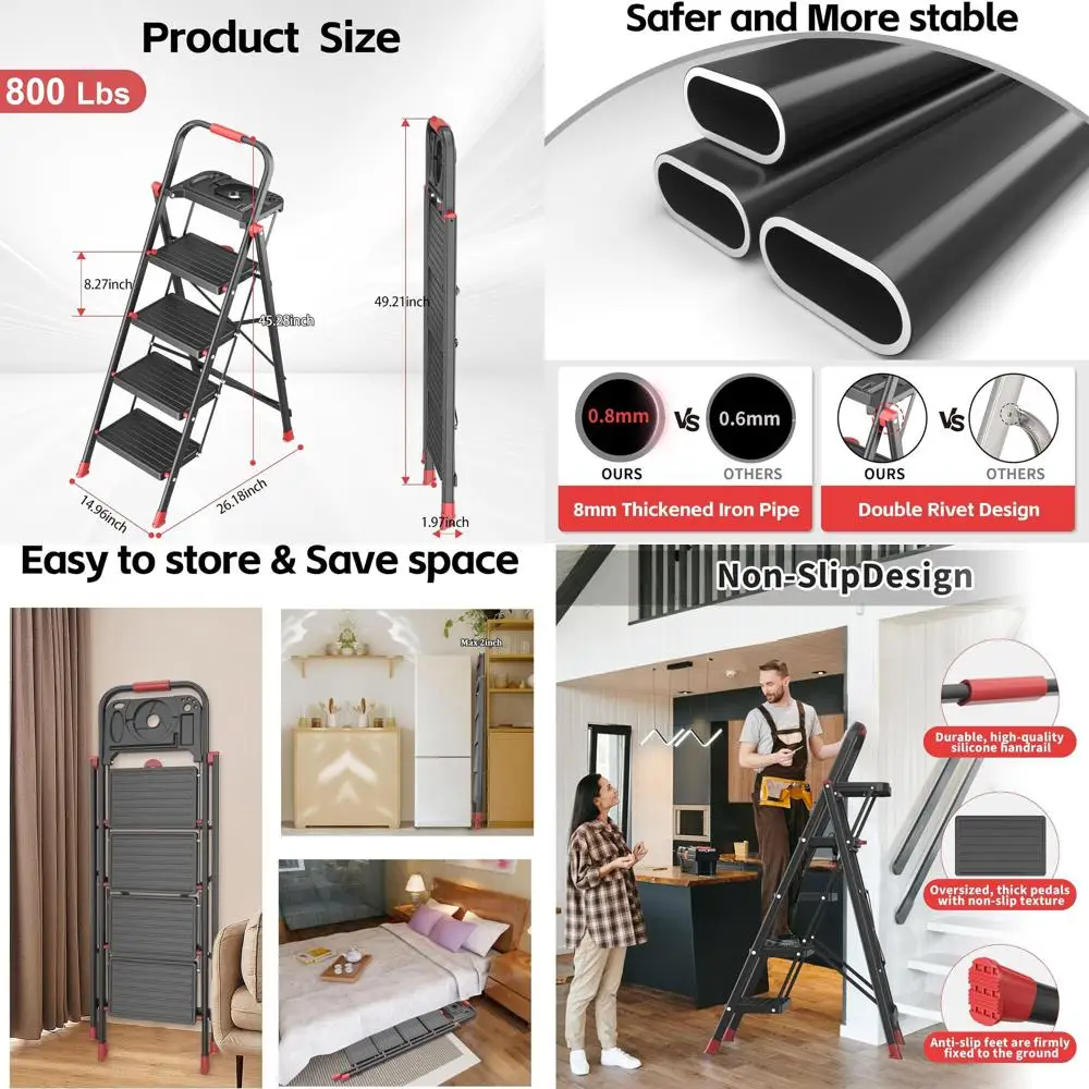 4-Step Folding Ladder with Multi-Tool Tray, Non-Slip Steps, 800lbs Capacity, Home Kitchen Use, Black & Red
