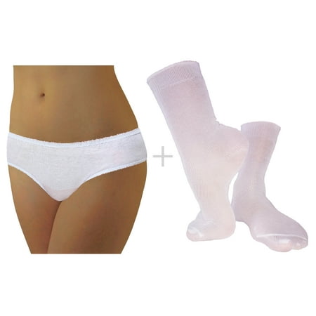 Underworks Combo - Women Panties and Crew Socks -10-Pack of Womens Disposable 100% Cotton Underwear and 10-Pack of Disposable Crew Socks - For Travel- Hospital Stays- Emergencies