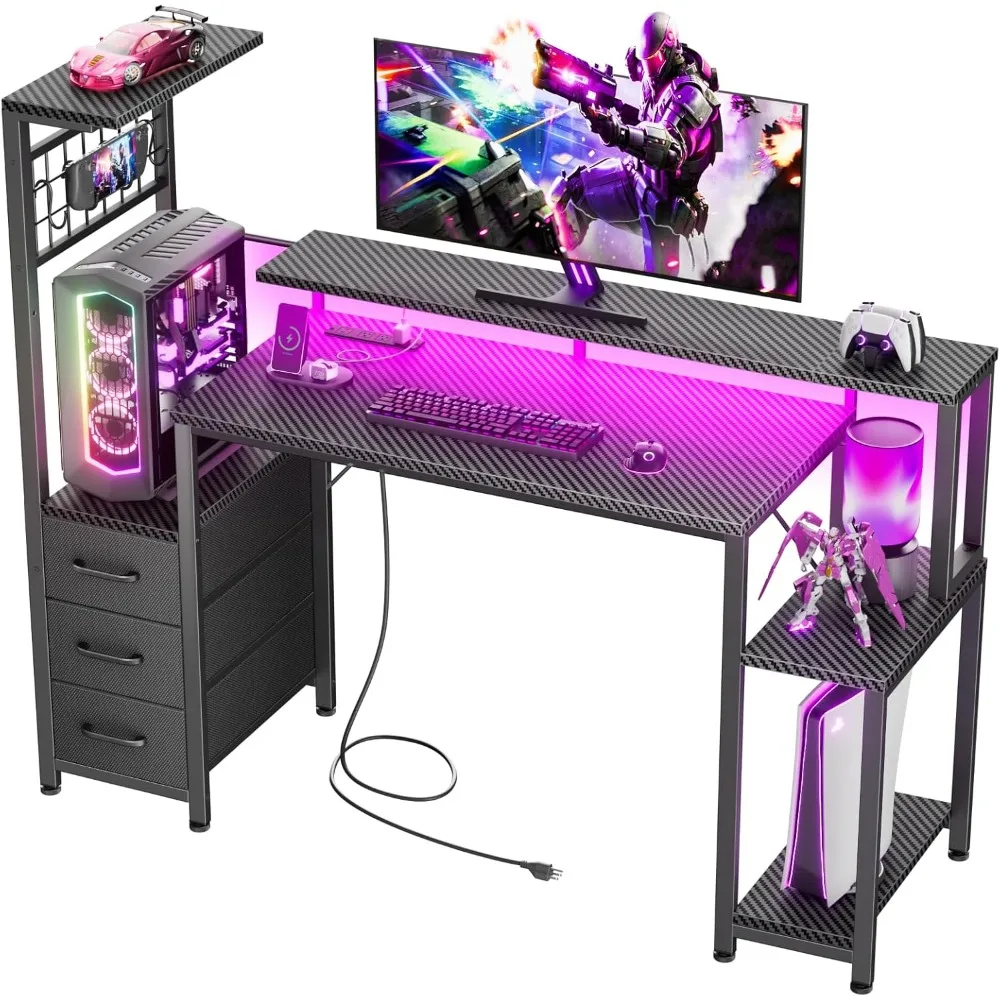 48 Inch Gaming Desk with LED Lights & Power Outlets,Computer Desk with Fabric Drawers & Side Hook,Reversible Gamer Table