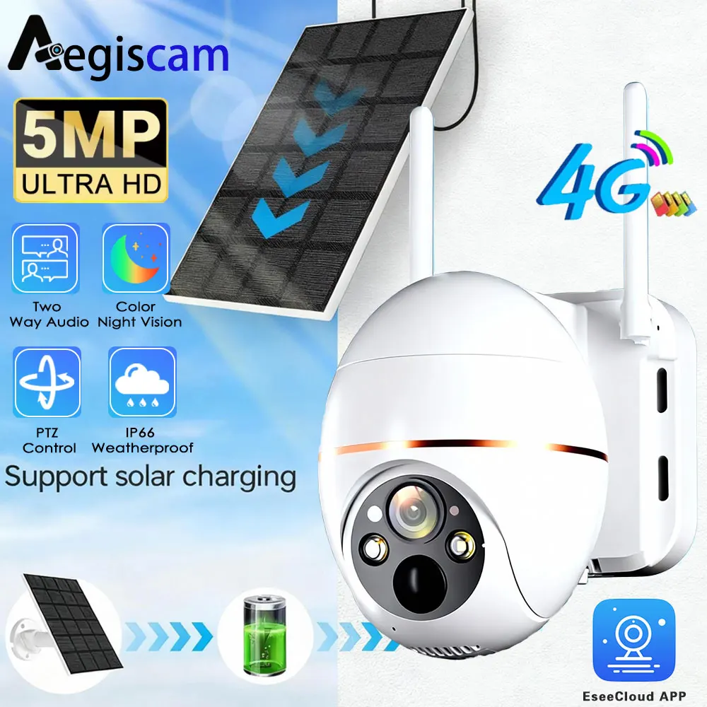 4G Solar Powered 5MP Outdoor PTZ Smart Security Camera with Built-in Battery PIR Motion Detection IP Surveillance Camera