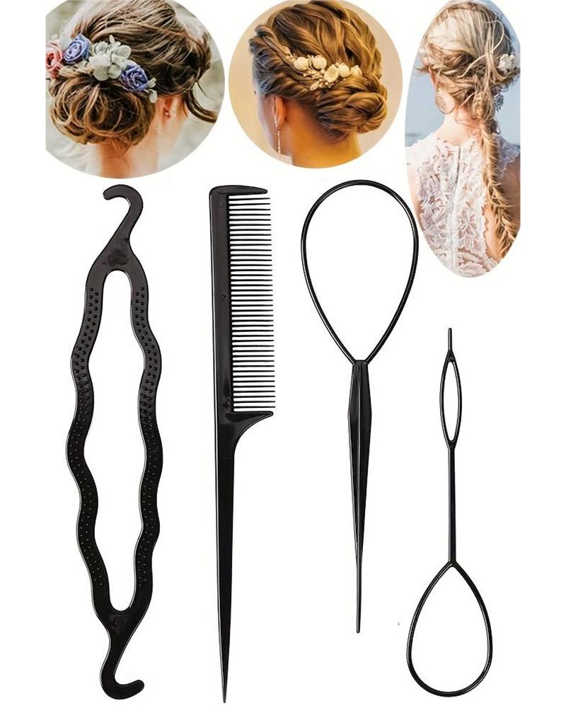 4PCS Bun Maker & Hair Braid Tool & Comb & Magic Hair Twist Hair Styling Accessories Kit Set, Black
