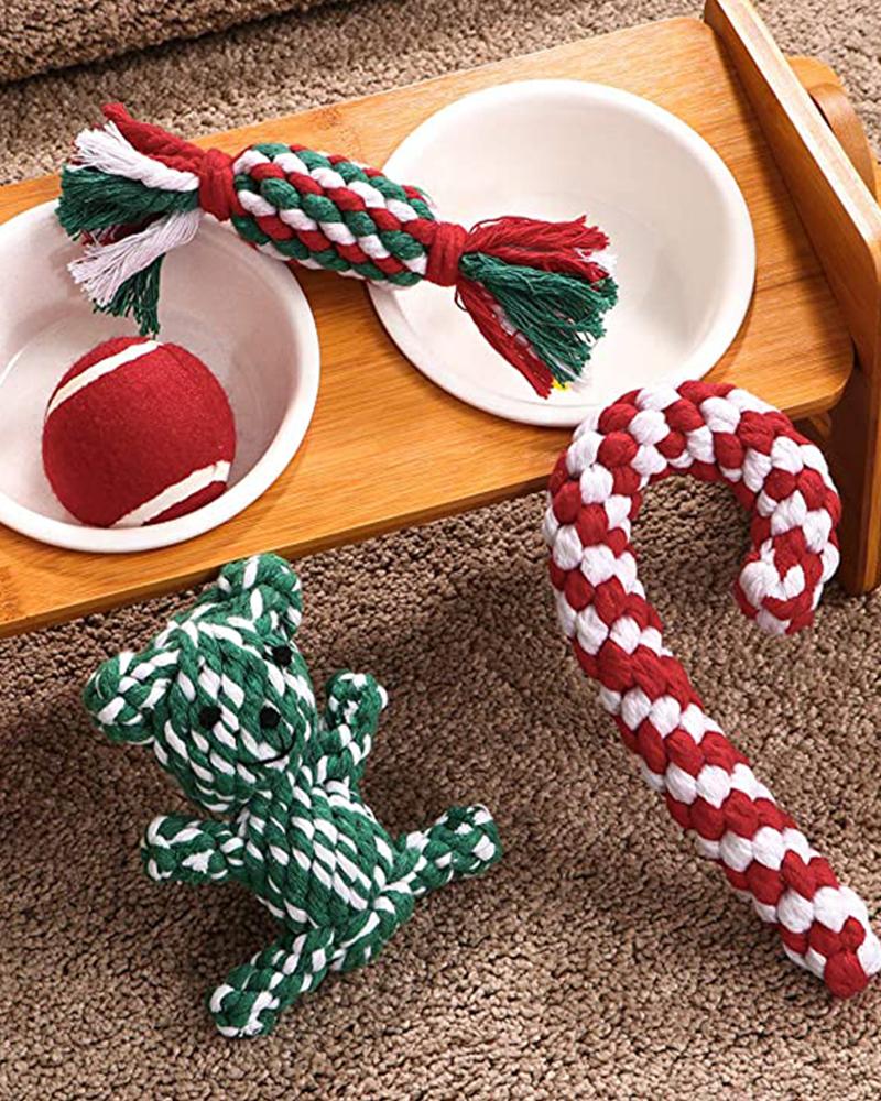 Package Include:4PCS Toys Set(With Red Ball & Candy Cane & Bear Toy & Cotton Knotted Rope)