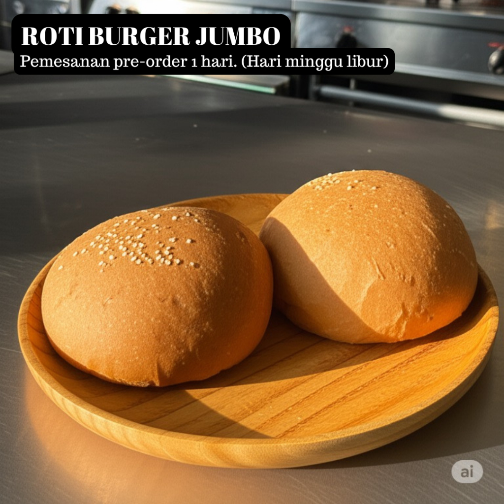 Roti burger jumbo atau jumbo burger bun ala Breadly Bakehouse sangat cocok untuk kebutuhan bisnis karena bertekstur lembut, diameter bervariasi 12 dan 15 cm serta roti diproduksi tanpa pengawet yang menjadikan roti Breadly Bakehouse sehat dan aman dikonsumsi untuk Anda, keluarga Anda, maupun customer Anda.