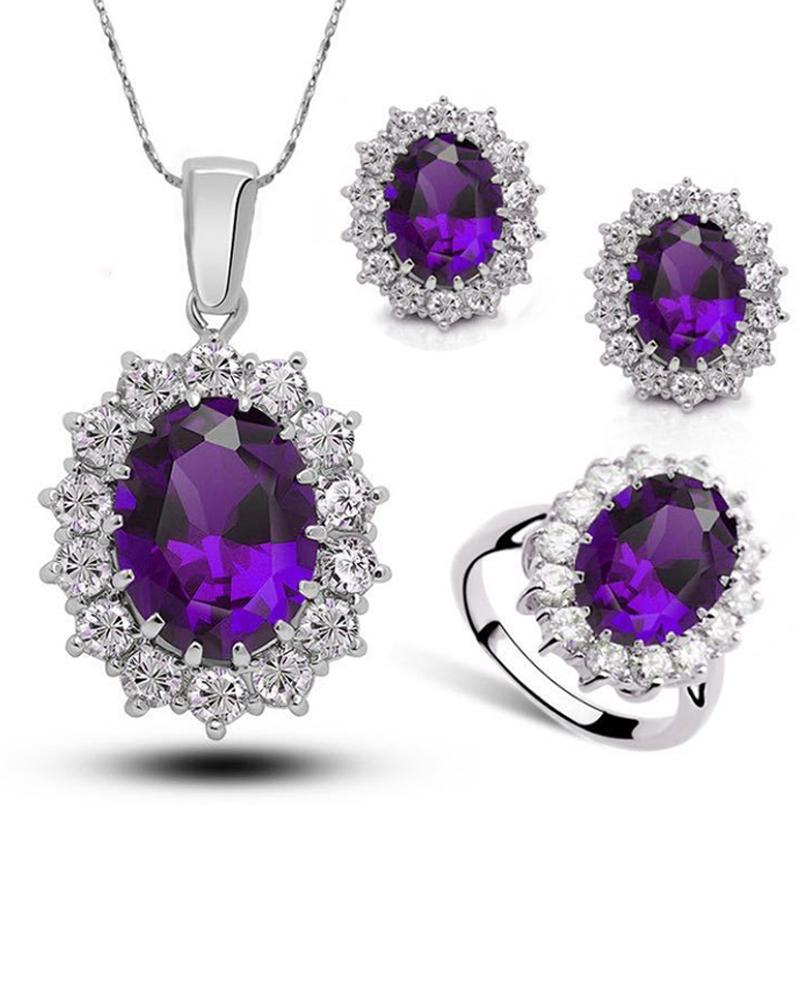 4PCS Rhinestone Stud Pendant Necklace & Earrings & Ring Set, Purple