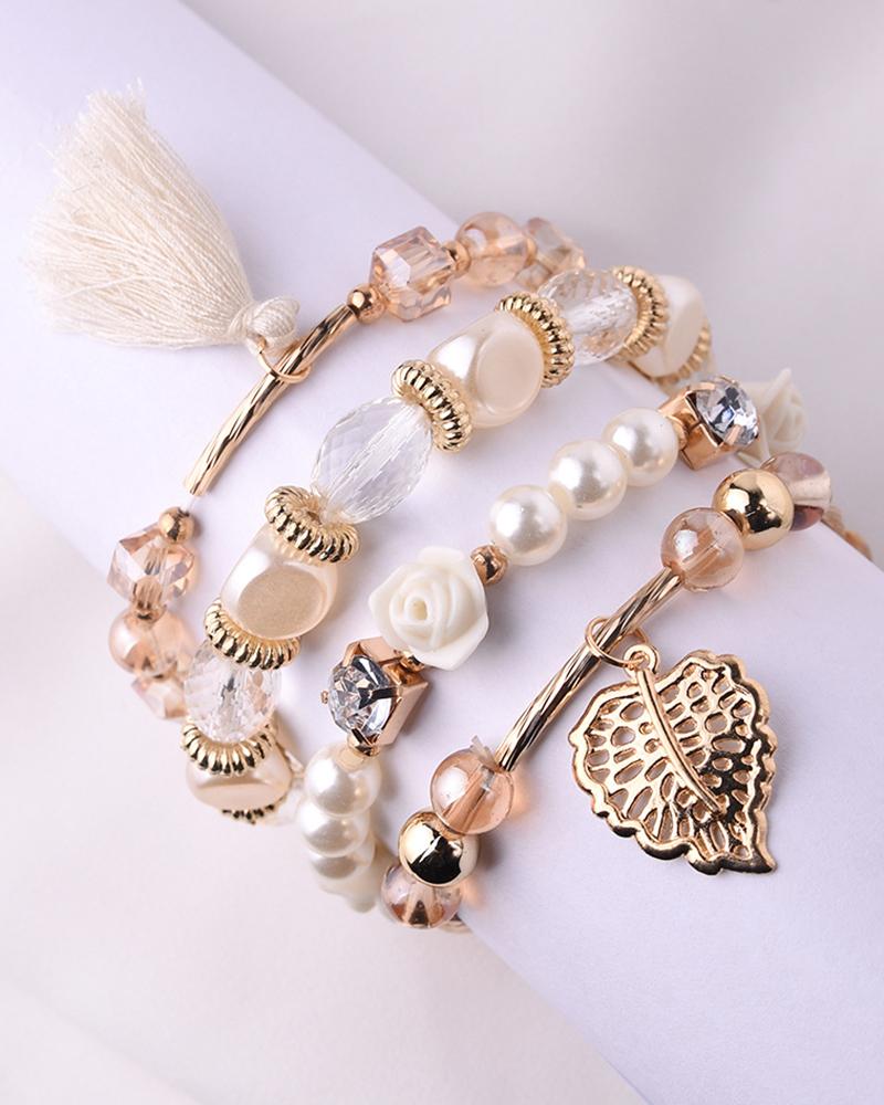 4PCS/Set Floral Leaf Pattern Tassel Design Beaded Bracelets, Beige