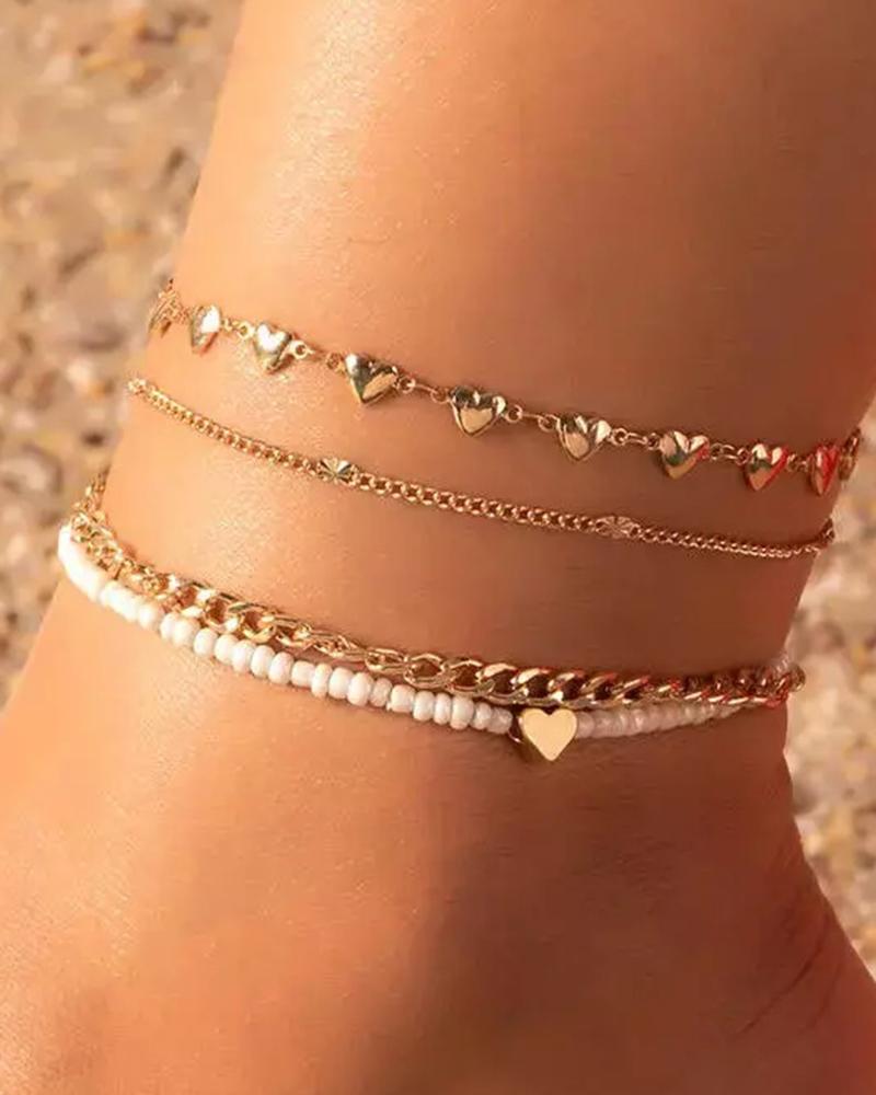 4pcs Heart Pattern Beaded Chain Anklets Set, Gold